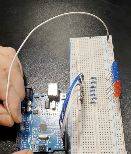 Insert the LEDs into the breadboard with their shorter, negative legs in the GND rail at the top of your breadboard. Then connect this rail to GND on the Arduino.