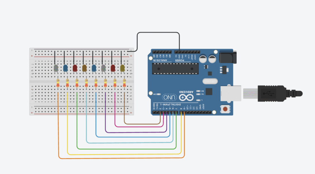 Make sure your wiring matches the pin numbers in your Arduino sketch. If your code defines pins 2 to 9, the LEDs need to be wired to those exact pins.